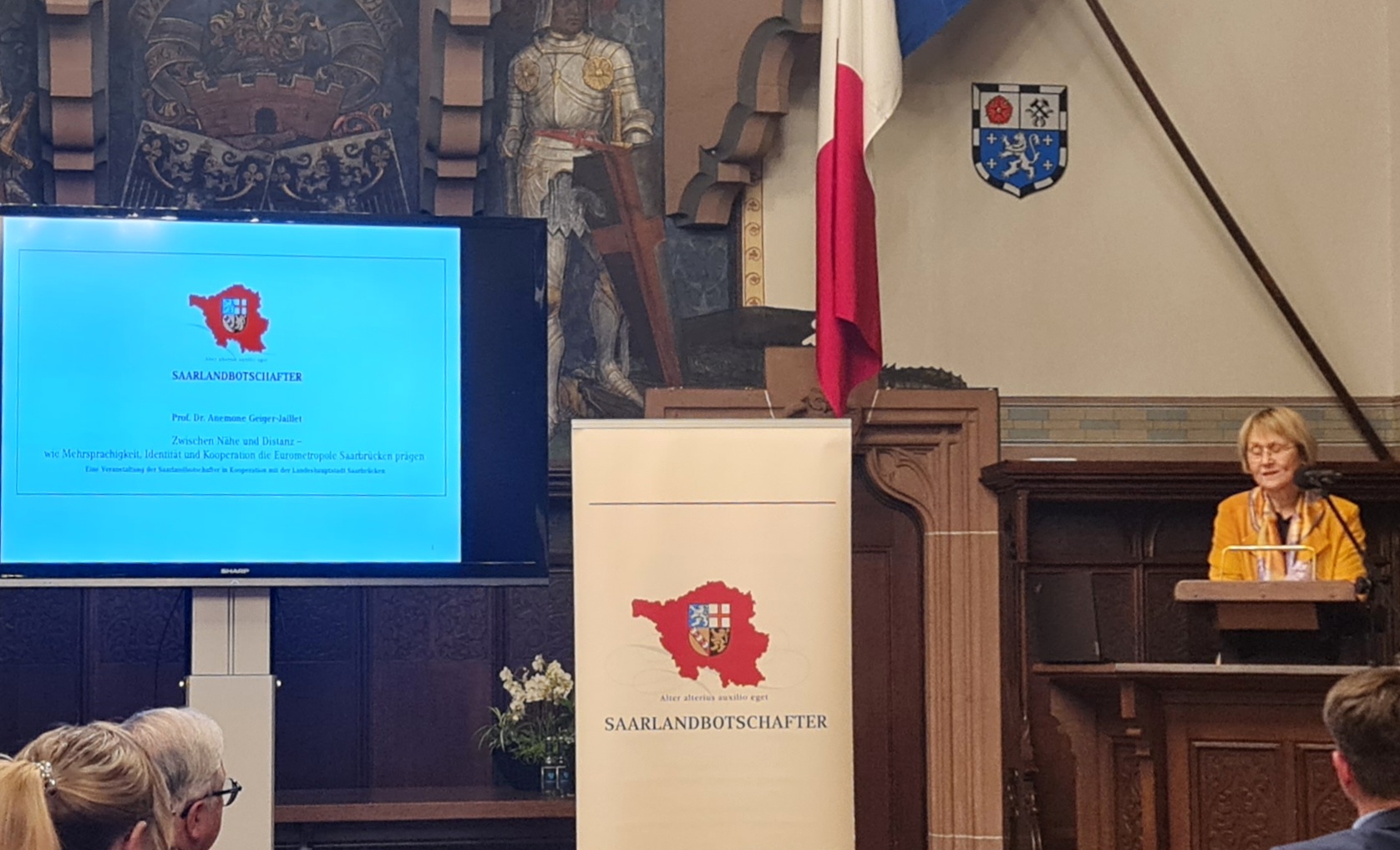 Im Anschluss beleuchtete Frau Prof. Dr. Anemone Geiger-Jaillet, Saarlandbotschafterin und Professorin für Sprachwissenschaft an der Universität Straßburg, zentrale Fragen des Zusammenlebens im deutsch-französischen Grenzraum. Sie hob die Mehrsprachigkeit als Schlüsselkompetenz hervor – im Alltag, in der Bildung, in der Arbeitswelt.